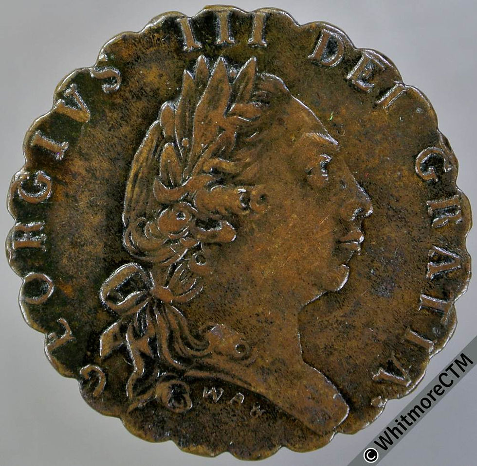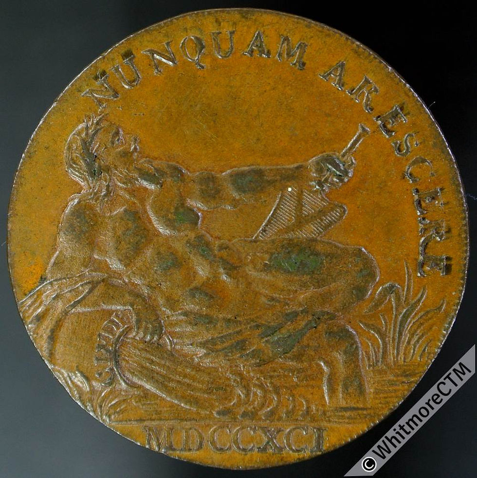 Beginning in 1787 huge quantities of copper pennies and halfpennies made their appearance. A mother lode of high grade copper ore had been discovered on the Parys mountain in Anglesey, and a consortium of businessmen found an unbelievably simple way to make their fortunes. They paid workers to extract copper, converted the copper into tokens and then used some of the tokens to pay the workers to extract more copper. The rest were put into circulation as everyone was willing if not eager to use the tokens in place of the remnants of old currency, enabling commerce to flourish unhindered. The tokens were made by the most modern techniques, even having letters around the edge. They were far better in appearance and quality than any coppers the Royal Mint had ever been capable of producing.