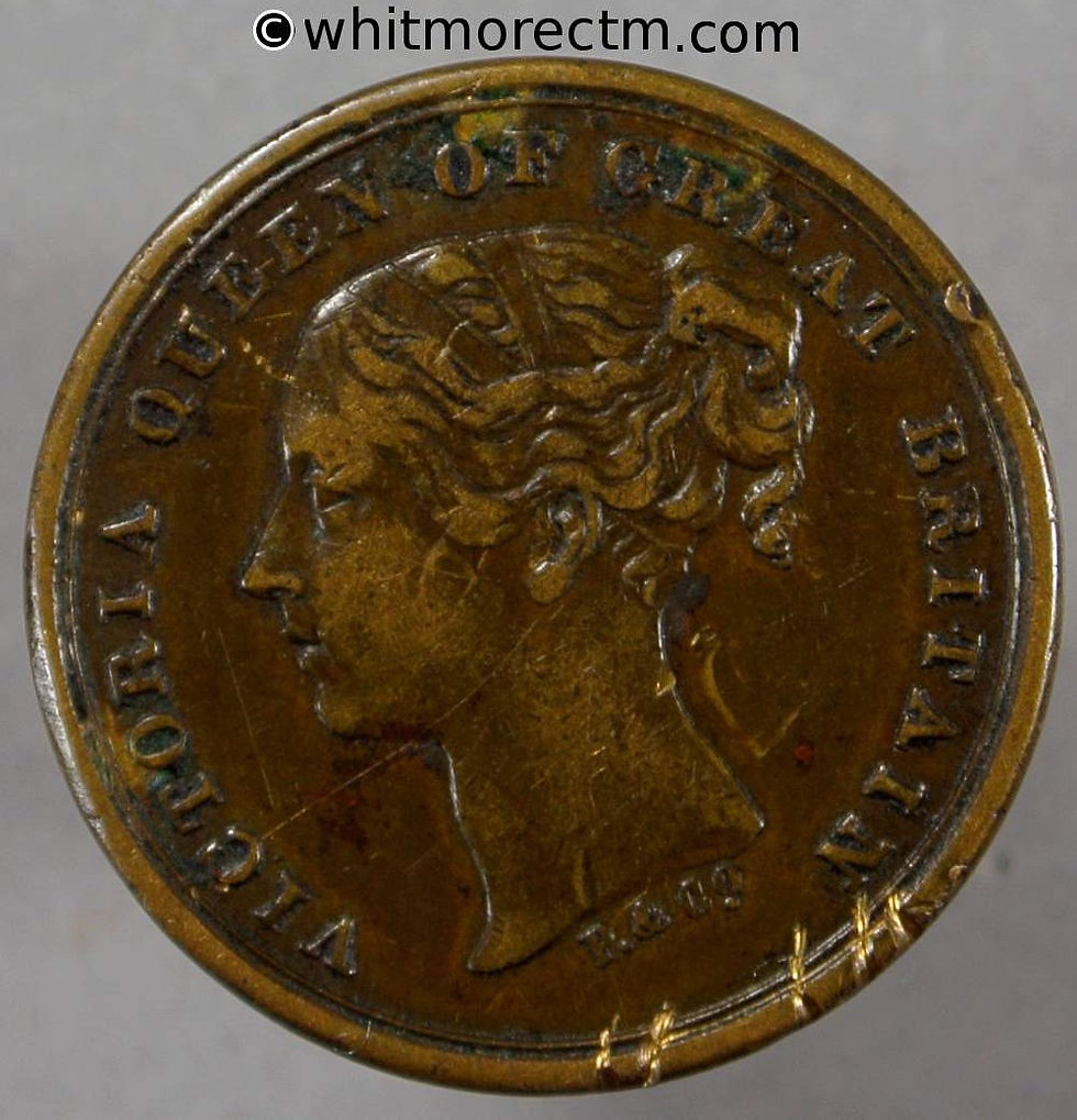 A rather mysterious series of anonymous farthing sized tokens, usually bearing the legend Columbia, appeared from time to time in the 1820's as temporary shortages occurred. In addition a wide range of traders issued their own farthings, which after 1838 often included copies of the coinage portrait of Queen Victoria. Some precautions against a charge of counterfeiting remained in that they rarely, except in Ireland, openly stated their value, and they never repeated the royal titles in Latin. Issues were particularly frequent around 1851, when the Crystal Palace erected for the Great Exhibition eclipsed the Queen's portrait as a popular device.