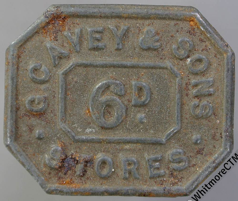 Value stated Token G. Cavey & Sons Stores 6D. Bracteate rectangular Iron